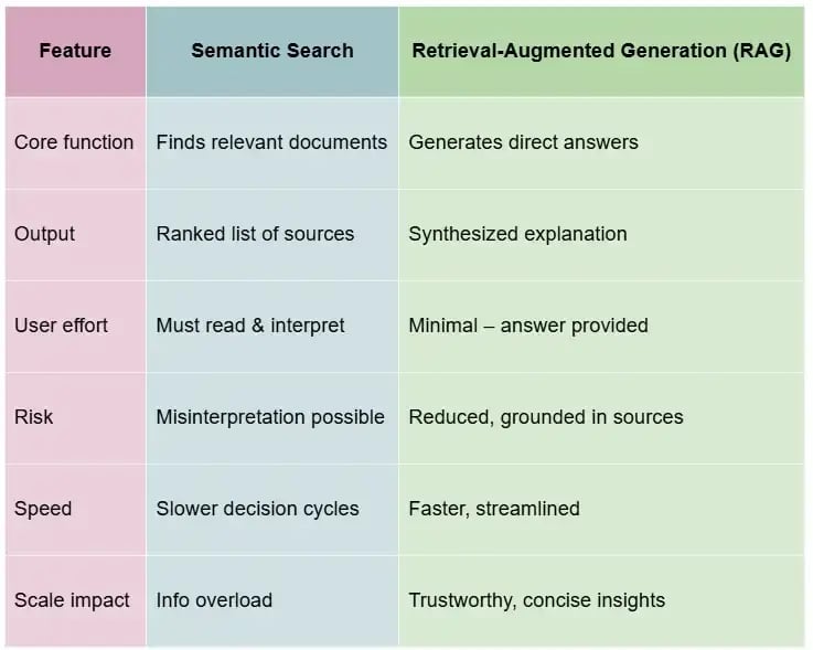 The system returns a ranked list of results, much like saying, “Here are three PDFs that probably contain your answer.” That helps you find information, but it still leaves the burden of reading, interpreting, and summarizing on your team.