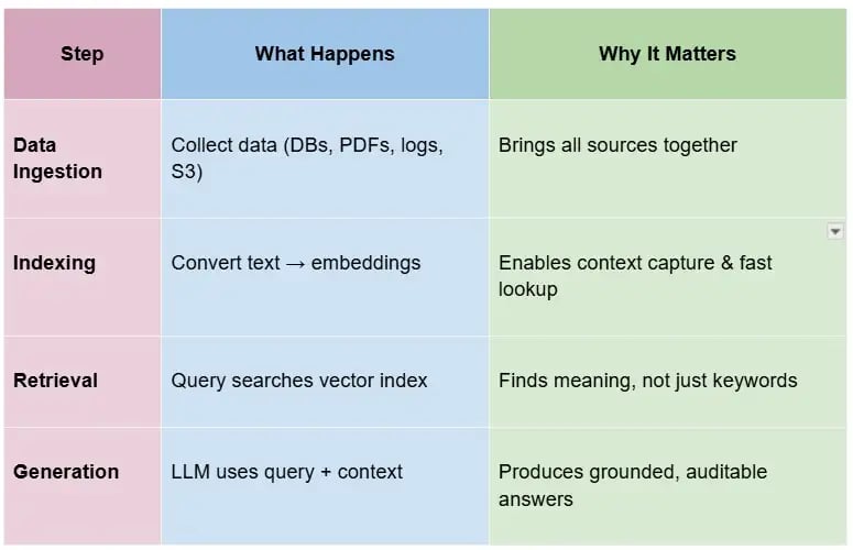 In practice, this means instead of handing you three policy PDFs, RAG generates a concise, human-readable explanation backed by those documents.