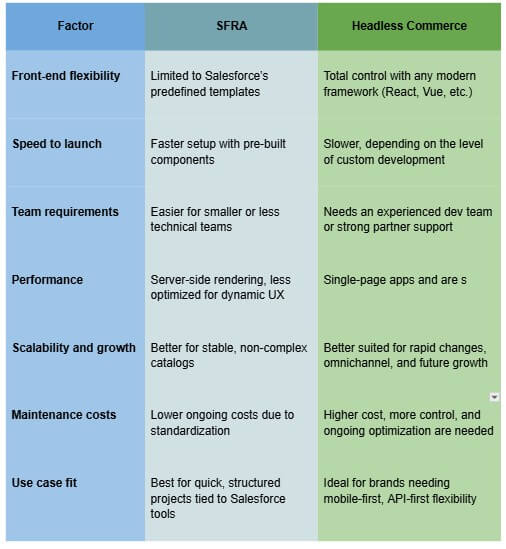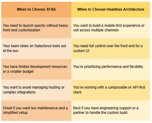 Start by looking at your team’s tech skills, launch timeline, and growth plans. If you need something quick and simple, SFRA may fit better. But if you want more control and long-term scalability, Headless might be worth the investment.